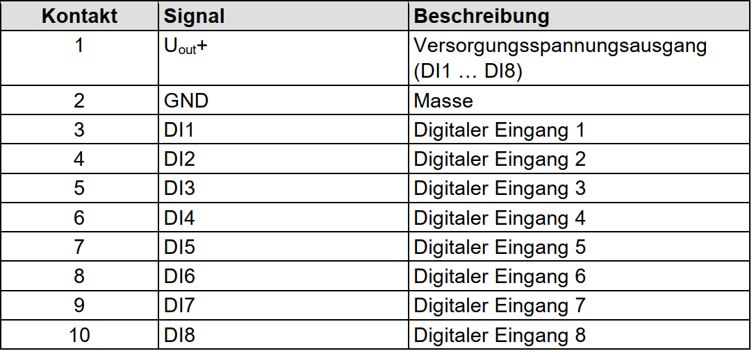 Jeder Eingangskanal besitzt zur Störunterdrückung einen RC-Filter mit einer Zeitkonstanten von 5,0 µs. Die Eingänge sind positivschaltend. Wenn das 24 V-Potential für die Systemversorgung Uout+ (Klemme „X12“) auf einen Eingangsanschluss geschaltet ist, wird der Signalzustand des entsprechenden Eingangskanals „high“.
